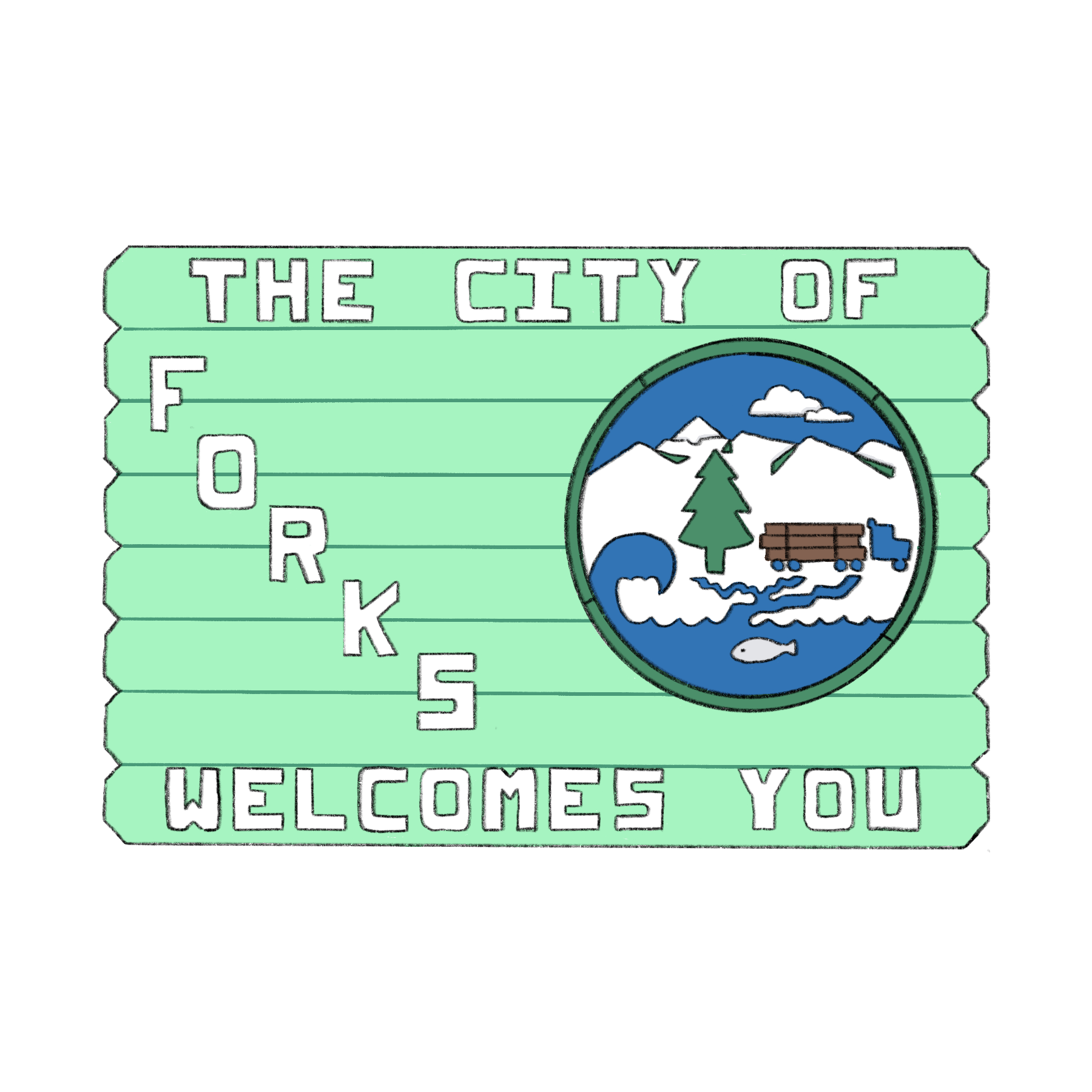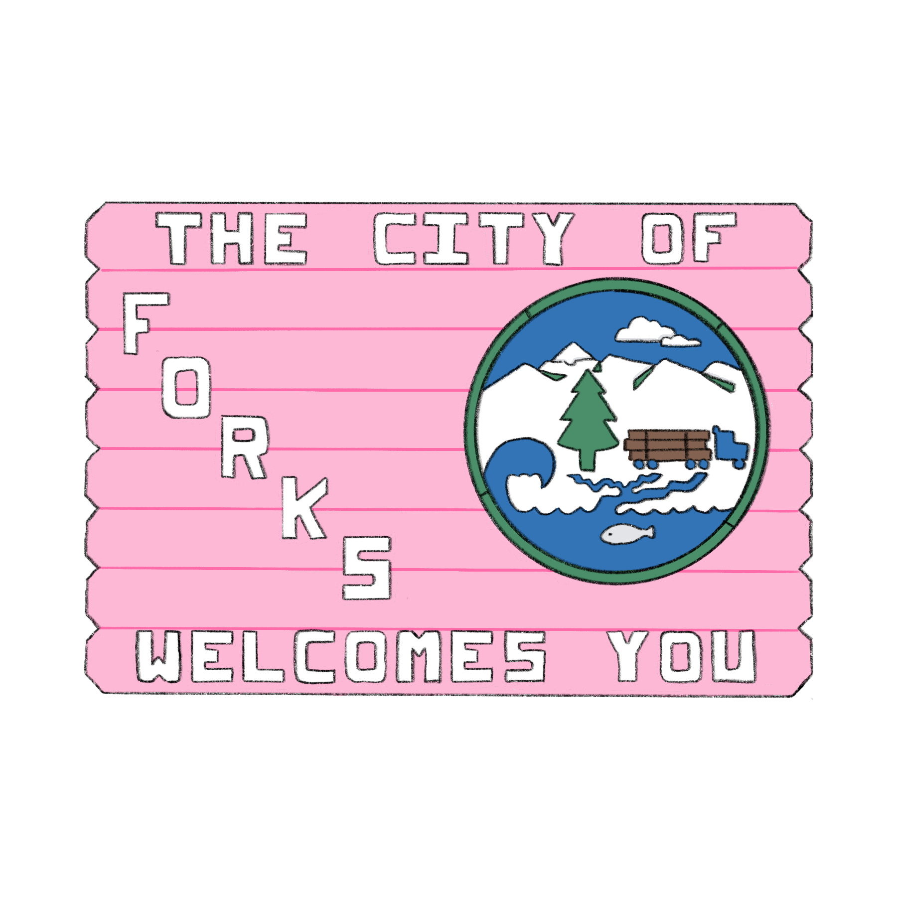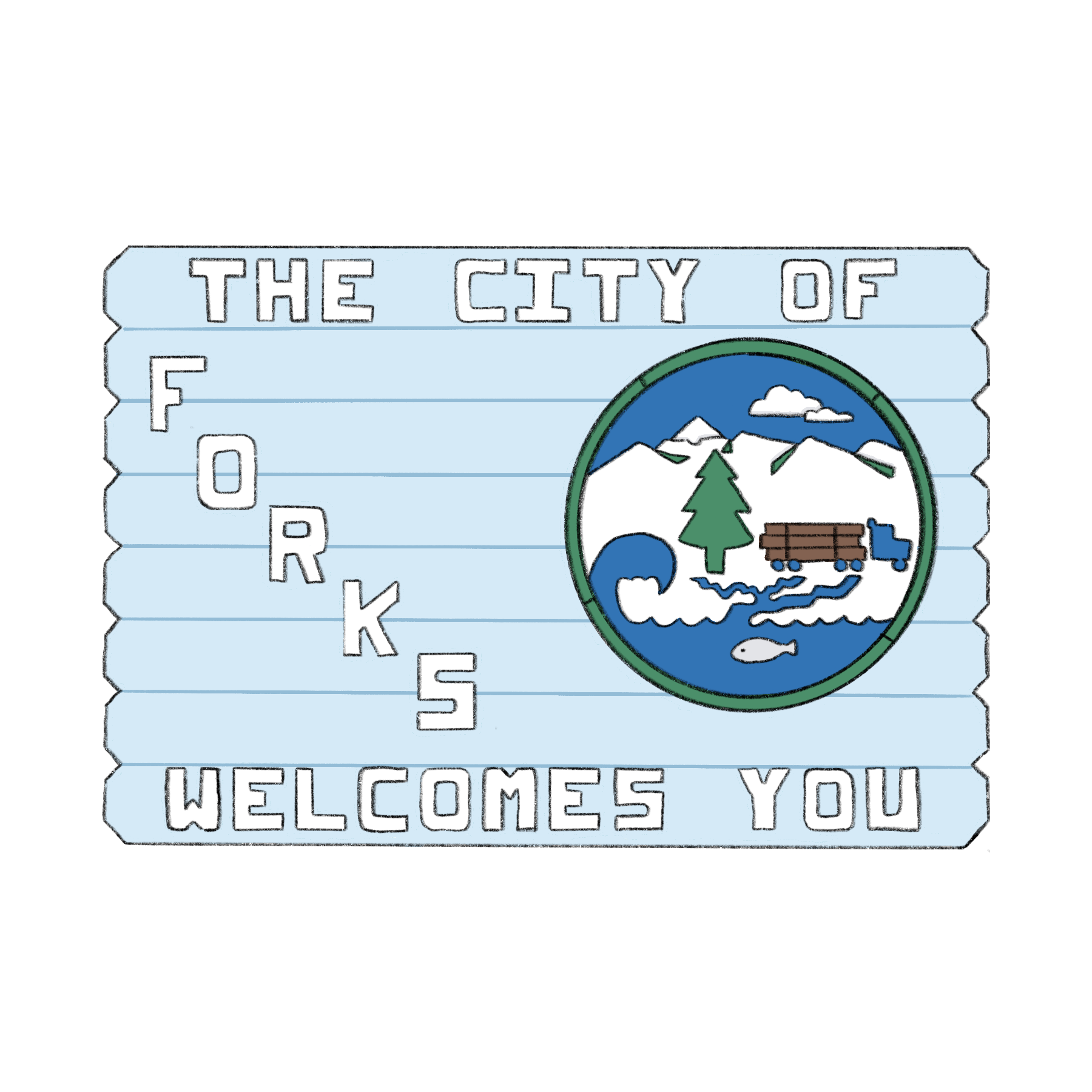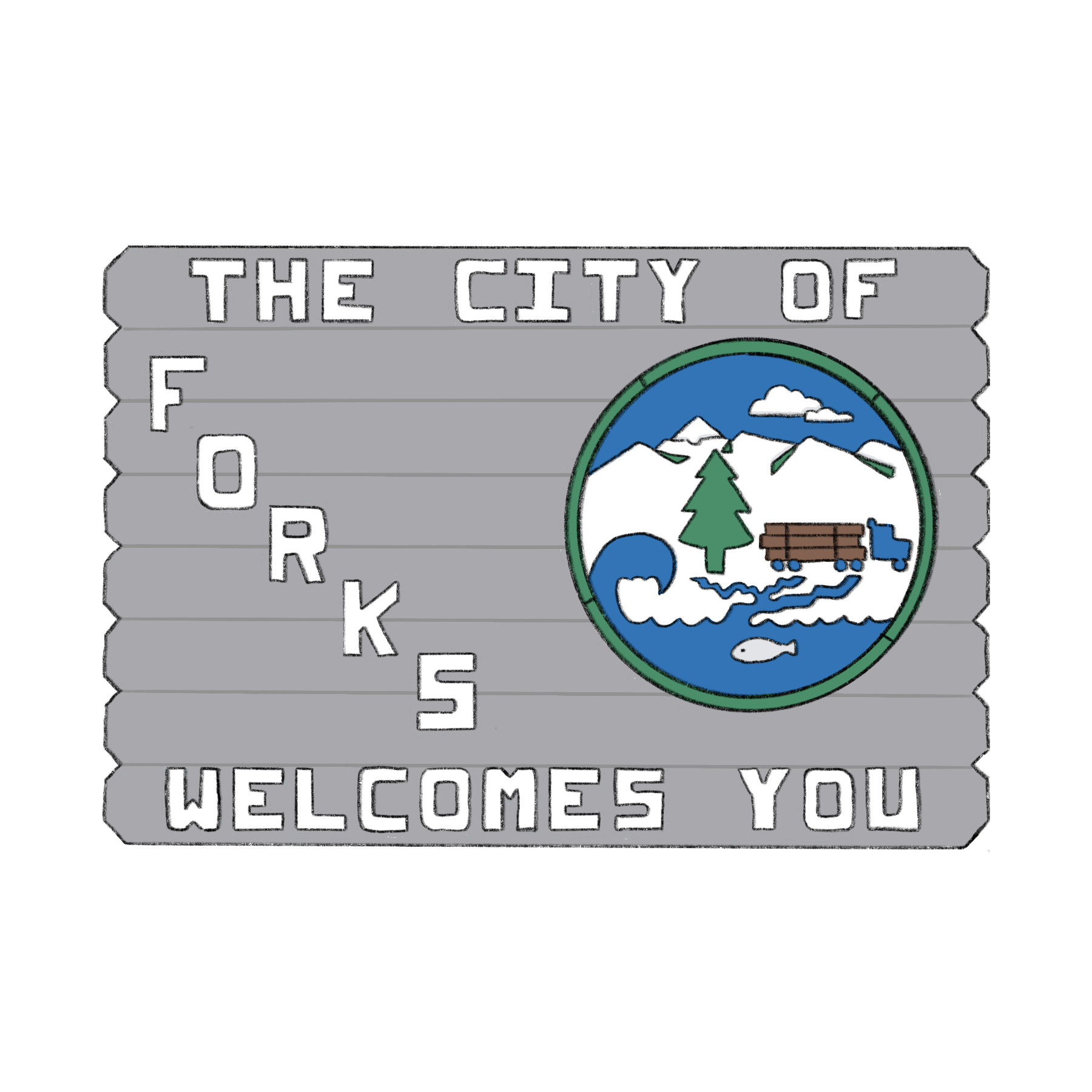 Autocollant qui contient une illustration du panneau de bienvenue de la ville de Forks inspirée du film «Twilight».